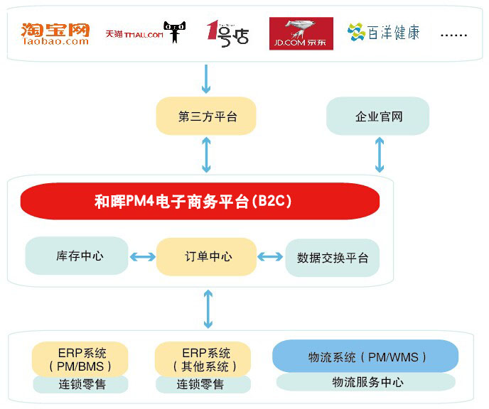 電子商務(wù)管理系統(tǒng)(B2C)包括前端訂單中心、庫存中心和數(shù)據(jù)交換平臺、電子商務(wù)后臺管理平臺,公司官網(wǎng)為企業(yè)互聯(lián)網(wǎng)門戶,也是電子商務(wù)交易平臺的一個入口,同時跟如淘寶、天貓、京東等第三方平臺的對接。