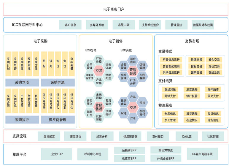 電子商務(wù)管理系統(tǒng)(B2B)包括前端電子商務(wù)門戶、電子商務(wù)交易平臺、電子商務(wù)后臺管理平臺,電子商務(wù)門戶為企業(yè)互聯(lián)網(wǎng)門戶,也是電子商務(wù)交易平臺的直接入口,交易平臺以鏈接形式體現(xiàn)在電子商務(wù)門戶界面。